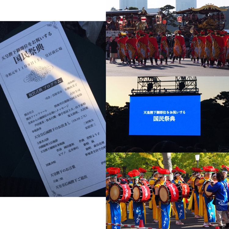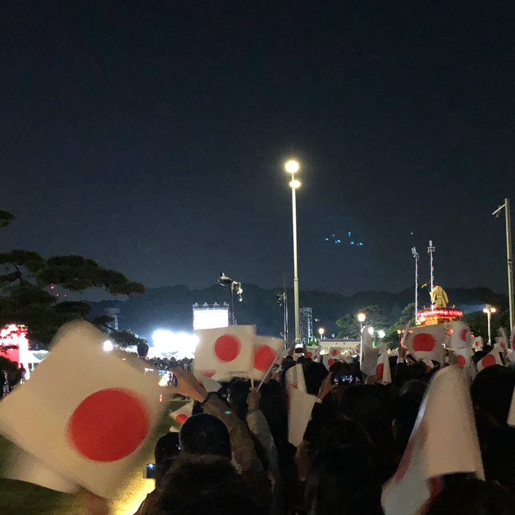 昨夜の天皇陛下ご即位をお祝いする国民祭典に参加しました。 昨日は雲一つない晴天で、夕陽から月まで空がこれ以上ない天候の開催でした。 . . 式典は約2時間、陛下のお出ましはうち30分 という構成でした。 . 参加者も一部のステージが見えるエリアを除き、 大半がスクリーン鑑賞。 . その場にいると、司会のお2人始め、祝辞を述べられたほとんどの方の緊張感がものすごく伝わってきたこと。 また音楽を耳だけでなく振動を肌で感じれた臨場感はならでわでした。 . . 音楽は日本書紀に沿って日本創世からの宇宙やそのスケールを感じる音楽で辻井さんの繊細で鷹揚とした演奏はやはり素晴らしいものでした。 . . 会場はものすごく寒く、カイロが配布されたのですが陛下の温かい笑顔と皇后様が目に涙をためられた場面は一気に引き込まれて寒さも感じなくなった程でした。 皇后様、生き生きと輝かれていて素敵ですね。 . . ちなみに会は万歳三唱があまりに続きすぎ、陛下もご退出のタイミングを少し戸惑われたようにお見受けしました。 またご退出後もずーーーっと万歳三唱を続けられ、会場にいた皆さんから笑いがおき、最後には緊張が解けた式典でした。 . . 明日のパレード、見に行かれる方のご投稿を楽しみにしています。 . 式典前は各地のお祭りが日中皇居前で繰り広げられており、非常に華やかでした。 #国民式典