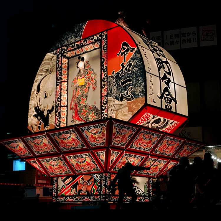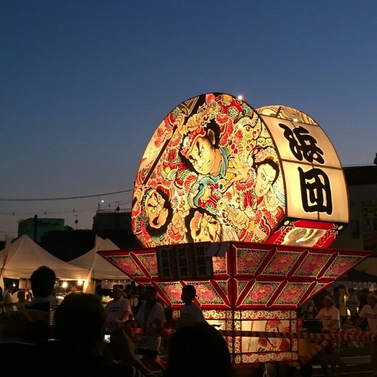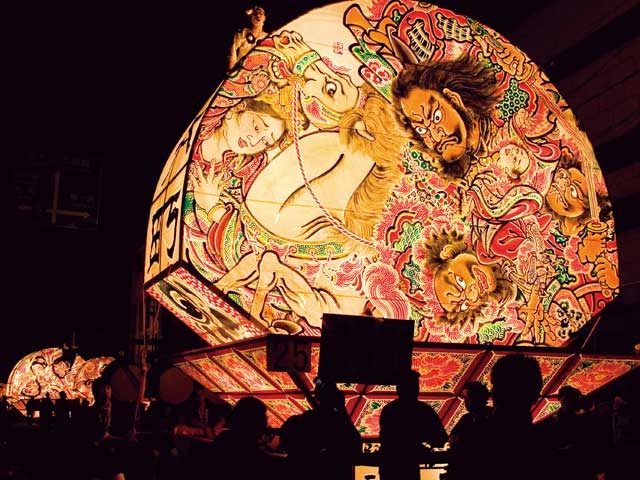 大小約70台の扇ねぷたと組ねぷたが笛太鼓の響きと共に堂々と巡行。表には勇壮な武者絵が描かれるのに対し、裏を飾るのは妖艶な美女。宵闇に幻想的な風景を作り出す。