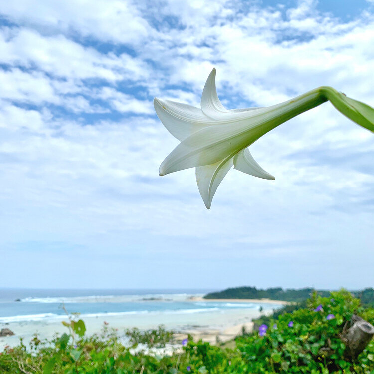 海に向かって咲く真っ白なユリ。 奄美にはユリ科の植物も多く自生しています。 これはテッポウユリでしょうか、誰が手入れするでもなく、見晴らしの良い海端に元気に咲いていました。 奄美大島北部のあやまる岬。その展望台付近で見かけました。ちょうど“みしょらんカフェ“という観光案内所&カフェのすぐそばです。眼下に海が広がるロケーション、薄曇りではありましたが偶然青空も覗き、さわやかな一瞬になりました。 ユリといえば奄美大島のさらに南側にある小さな離島、請島(うけじま)がその名の由来になったウケユリという固有種があります。海岸ではなく山に咲くユリですが、この写真を見ながらウケユリという名前がふと脳裏に浮かびました。 ・ みしょらんカフェもガラス張りのかわいい建物で絶景が楽しめます。空港から近く、観光情報も集められるので旅のスタートにもおすすめです。 この写真は私が奄美から東京に転勤になり、その奄美出発の日に飛行機まで時間があったので寄り道したときのもの。コロナでカフェはお休みでしたが、最後に思いがけず美しい自然の姿を見ることができて良い思い出になりました。 #あやまる岬展望台 #あやまる岬 #みしょらんカフェ #ユリ #花さんぽ #奄美 #奄美大島 #自然にふれる