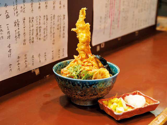 「もはや芸術」というほどに盛られた天ぷらを目当てに、開店前から行列が絶えない天丼専門店。揚げることで素材の風味がアップした天ぷらにからむのは、秘伝の醤油ダレ。食欲がそそられる。