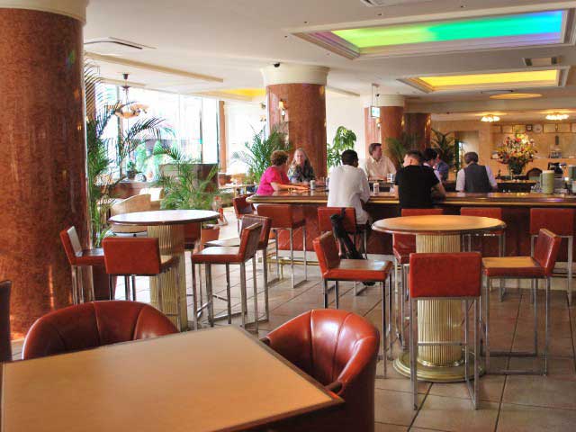 ホテル1階にある約100坪の広々としたバーは、カウンターを中心に早い時間帯から外国人客で活気づく。ウイスキーやバーボンなど洋酒の種類が豊富で、ラム酒も人気。