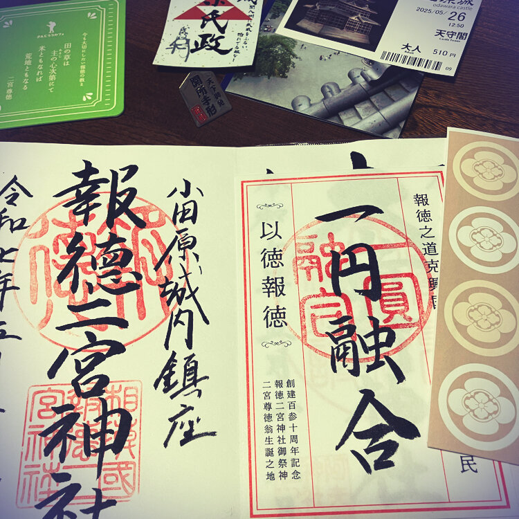 〈小田原+湯河原♨️旅日記 その1*小田原城〉 少し日が経ってますが、覚書の旅日記です。 先週18日・19日と、関西に住む友達2人と、小田原~湯河原温泉の旅を1泊で楽しんできました。 当初は箱根を拠点に考えていましたが、先日の台風の被害状況と大雨の天気予報を検討して、泣く泣く別プランに。(次回こそは地域応援も兼ねて、リベンジしたいです) 土曜の明け方に集中して雨が降ったものの、傘の出番はほとんどなく、ほぼ行きたいスポットは全て快調に楽しむことができて、大満足でした! 想像をふくらませながら、一緒に楽しんでもらえたら幸いです。 食事も、お風呂も、極楽気分の中、3人が繰り返し話したのは、「誰と一緒に過ごすか?」が最も大事ということ。 7月から計画を立てて、こんなこと・あんなことしようねと温めていても、天候があやうい今年のような場合は、行く手を阻まれることもあります。 諸事情でやり繰りが過密になることもあります。 それでも、皆がそろうのだったら、大変さもなんのその。 頭の中では、皆で笑って喋ってる姿ばかり連想できたので、きっと大丈夫と信じてたのが大きかったのかな。 私も家族事情で綱渡り状態だったけれど、なんとかなっちゃうものですね。 なんとかする!に近かったけれど、結果オーライでした。 五感をフルに刺激して、大好きな友と心から笑って、何でも語り合えるって、本当に有難いです。 こちらは初日の小田原の旅模様です。 霧雨の中、ここは外せないと、小田原城へ行きました。 戦国大名の北条氏の居城となると隆盛を誇り、関東支配の中心として、豊臣秀吉の攻撃に備えて、城の規模も大きくなったそうです。 併設されてる「SAMURAI館」は、刀や兜・鎧に興味ある人なら楽しめますよ。 左下は、ブラタモリの番組で、タモリさんが着用した兜とか。 右下はプロジェクションマッピングで描かれた武士のスピリット。桜吹雪が華麗でした。 #小田原 #小田原城 #サムライ
