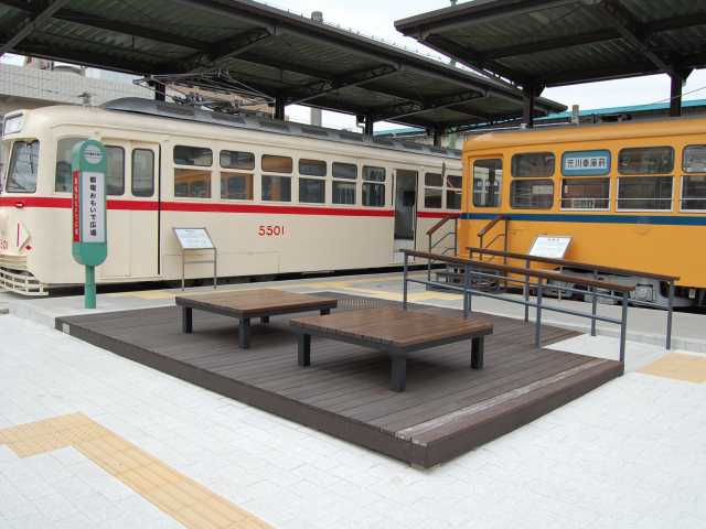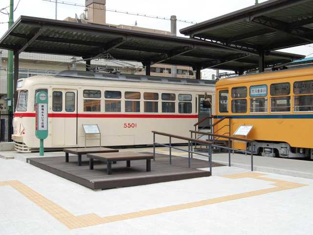 懐かしい停留場をイメージしたスペースに旧型車両2両(5500形、旧7500形)を展示。車内には、昭和30年代をテーマにしたジオラマもある。