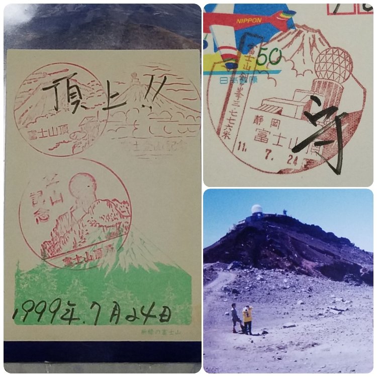 見つかったよ!古葉書   🗻📮 ____ 💌 . 富士山山頂郵便局の記念スタンプと風景印 1999年・夏 思い返せば、私とKさんと、何年か前に百名山を制覇した夫婦(この夫婦は次の週も別グループで富士登山しています)の4名での登山でした。 前の週に登る予定でしたが、お天気が悪く、 1週延期しての 7/24 ☀ 早朝、5時頃 静岡の富士宮口4合目より下に車を停めて(満車で路駐状態)そこから5合目まで1時間くらい歩いて… 少し休憩してから登り始めました。 金剛杖買ったよ😁 一番体力の無い私にペースを合わせてくれて、 🗻頂上(富士奥宮)に着いたのは午後13時を過ぎていたと思います。 山登り夫婦は剣ヶ峰へ! (当時はまだ気象観測のレーダードームがありました。) 私とKさんは体力限界で、 お昼を食べてへたばっていました😱 剣ヶ峰までは、あと数百メートルだったのに💦‬ 山登り夫婦に勧められて、🗻富士山山頂郵便局でハガキにスタンプ押印!! 投函 🗻📮 _____ 💌 . 疲れてて、酸素薄いし、思考能力も低下していたとおもいます。😅 宛名の字を大きく書きすぎて、風景印、文字に被っているし(笑) 記念スタンプはブレブレだし😅 裏面のこの殴り書きの大雑把感(笑) 🗻〠消印の風景印には 気象観測ドームがデザインされています。 今は山頂にドームが無いから変わったのかな? 今でいう 弾丸登山🗻🤪 夕方17時頃には5合目に下りてきました。 過去、一番酷い筋肉痛の経験😭 山梨に戻り、自分の車に乗るのも大変でした。 運転はなんとか無事に…自宅に着きましたが 階段登るのが大変で、、、手で足を持ち上げないと階段上がれない経験は初めてでした🤣 もう二度と富士山なんて登るものか!! と思っていましたが、 剣ヶ峰、行っていないんですよね…🤔 20年も前の事なのに、よく覚えています(笑) #静岡県#静岡#ことりっぷ静岡#富士山#登山#風景印#富士山山頂郵便局#風景印図鑑