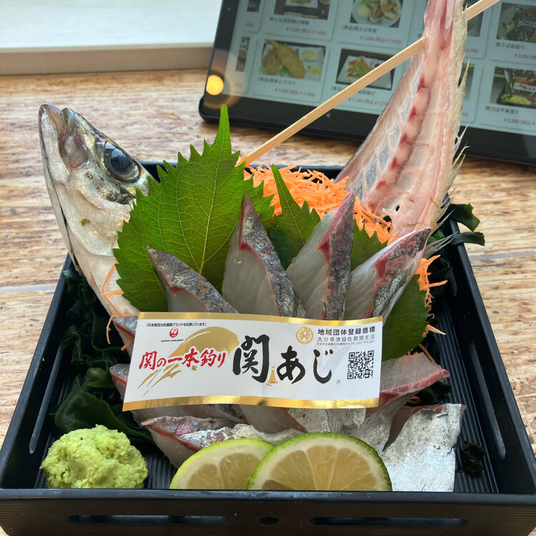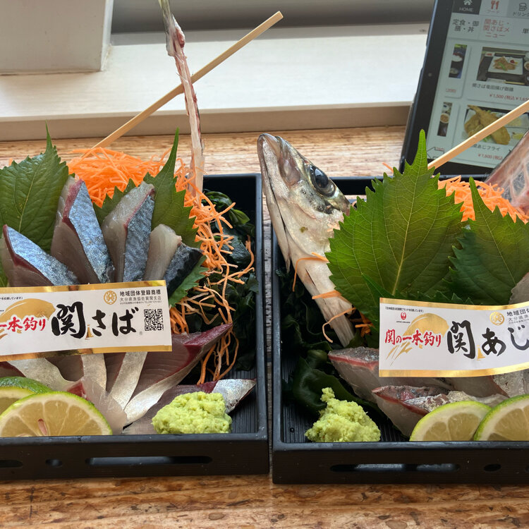 さんふらわあ🛳️で大阪から大分に行って飛行機で帰ってきた⑦ 宇佐市から車を走らせ大分市まで行きます🚙💨 そうここは佐賀関⚓️✨ 、 今回の最大の目的は佐賀関に関サバ関アジを食べに来たのだ😊🐟 、 13:00到着で駐車場満車ですがお一人様はズンズン中に案内されていきます😊特権 、 さて、この関サバと関アジですが 瀬戸内海と太平洋がぶつかりあう豊後水道で獲れるマサバとマアジ🐟🐟 、 いずれも一本釣りされて佐賀関港で揚げられるのが条件です🎣✨ 、 豊後水道は流れが速いため身が引き締まり、歯応えと旨みがあるのだ🧑‍🎓 、 どっちにするか?両方とも食べますよ😋 ハーフ&ハーフなんて事はいたしません。1匹ずついただきます😋 、 カウンター席からは海が見えます🏖️ 程なくしてやって来ました😊まずは関あじさんがご到着です😊 、 あらあら綺麗なお顔です🐟 身は確かにしっかりしてる。角が立ってます😊 味も美味しい😋 、 続きまして〜本日の大トリ関さばさんの準備が整いました✨ こちらも身がツンツン⬜︎歯応えしっかりして味も濃い😋 ちょっと醤油が甘すぎですがそれも産地の味として楽しめます😊パクパク行っちゃいました 、 今回はお刺身ですがまた焼きやフライも食べてみたいな😋 #あきらの九州