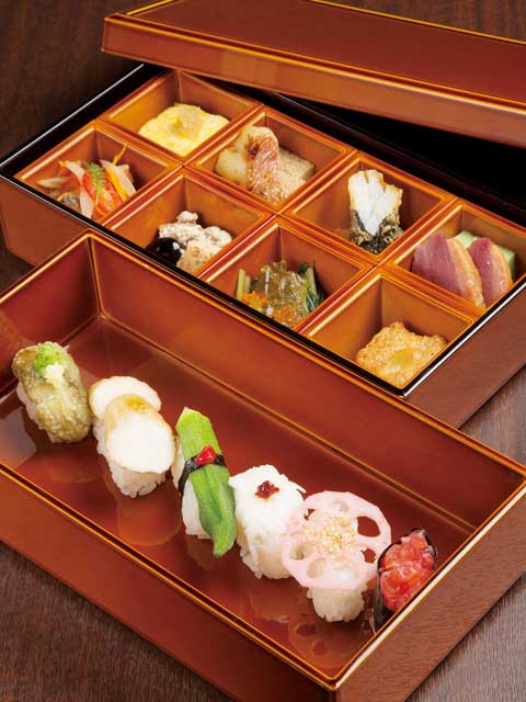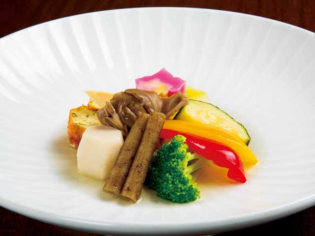 評判を呼んでいる「野菜寿司」は、旬の野菜にひと手間加え、まるで鮮魚のようにシャリと合わせて握る。10品以上の野菜を盛り込んだランチメニューの「八彩弁当」はとくに女性に好評。