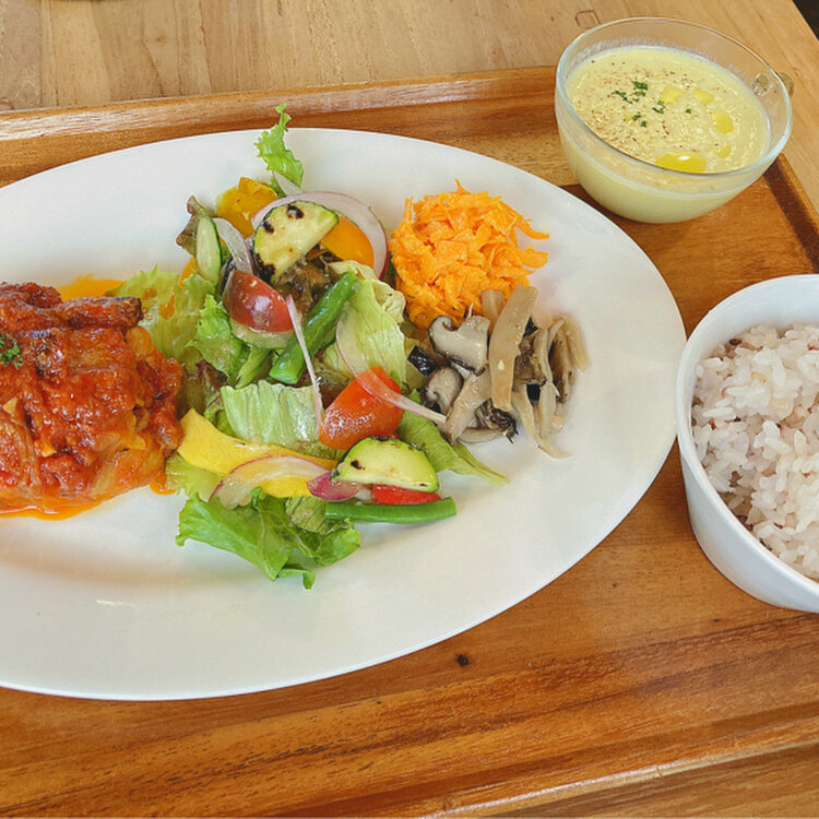 CREEKとは水路のこと。カフェは美しい森の中、澄んだ水が流れる小さな水路のそばにある。森の風景を眺めながら、地元素材を生かしたランチや季節のスイーツを味わえる。