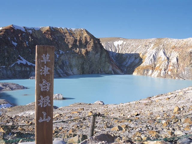 群馬県、長野県にまたがり、緩やかな連峰を形成している活火山。山頂に湯釜、涸釜、水釜という火口湖を擁する景勝の地で、志賀草津高原道路沿い最大の観光スポット。