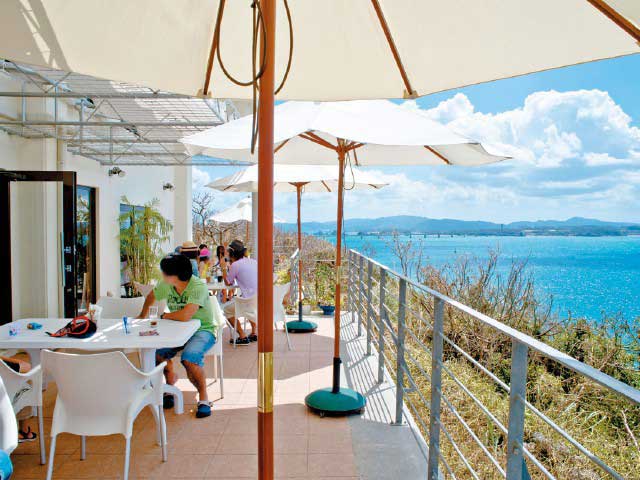地元食材を使った家庭的な料理が味わえる。オープンエアのテラス席からは古宇利大橋や本部半島、伊江島の城山まで望めるパノラマビューが圧巻。