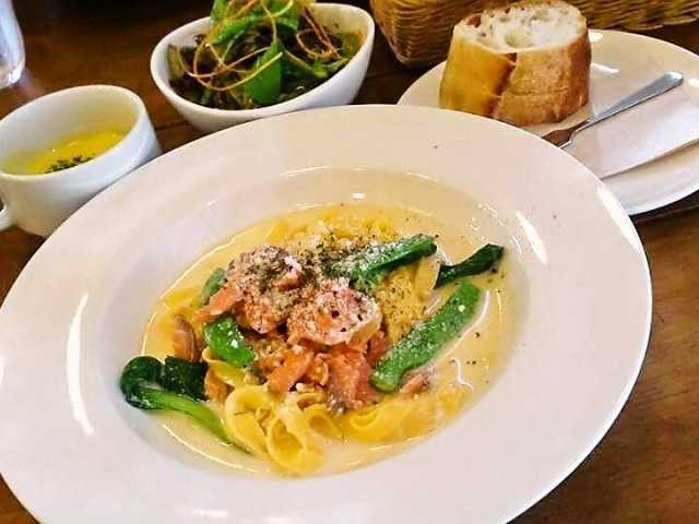 大正ロマンの雰囲気漂う元公民館の建物を改修したパスタと天然酵母パンの店。焼きたてのパンや、地元の魚介や野菜をふんだんに使ったパスタは絶品だ。