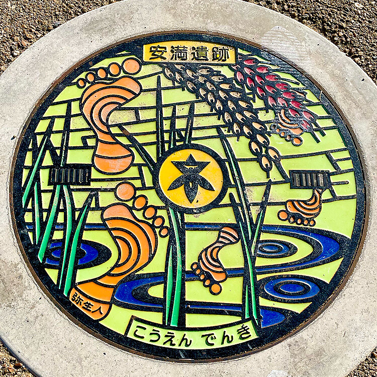 【2日目は高槻市】⑨ 3/7 今城塚古墳はお名残惜しいけど次へ❗ JR高槻駅に移動。ユーザーのhanaさんが投稿していた遺跡を目指しましょう💨💨💨 #カラーマンホール があって #マンホールカード がいただけるようです。 [安満遺跡公園](あまいせきこうえん) 今から約2500年前の弥生時代の集落跡 水田の跡。弥生人の足跡👣が出てきたらしい。 道案内のようなものが歩道に記されている。約100mくらい歩くと次の道案内が.... 弥生人だと何歩で歩ける.....それで私も数えてみたんです。 えっ👀⁉️ だいたい弥生人と同じような歩数❗ つまり弥生人と足の長さが同じくらいなの(・・? 私は短足ですよぉ~😅  チョコマカチョコマカ🚶‍♀️💨💨💨 歩きますよぉー😂 何だか嬉しいやら悲しいやら..... 歩数計の数字、稼げますね😁 2種類のカラーマンホール見つけた‼️ 足の形、確かに私と似ている。見つかった足跡と同じ寸法で描いているんですって。 あーー、足をのっけて比べてみればよかった....😅 マンホールカードは 『ポーネルンド Park Center 』のなかにある公園事務室で貰えます 公園内には2種類のカラーマンホールが設置してあります。 一日中歩きすぎてヘトヘトへ(×_×;)へ 奥の方にお墓の遺跡とかあったみたいだけど、もうダメだこりゃ(/--)/ 弥生人の足跡👣 どこかにあったのかな? 写真もあまり撮らず....つまりパンフレットから撮った写真だけど、こういう集落があったのよ。 また、駅まで歩くのかと思うとこれで終了。もう4時すぎているもん😅 せっかく来たのにね...高槻市にはキリシタン大名の高山右近の史跡もあるのだけど、もう時間切れです。 #安満遺跡 #高槻市 #弥生時代 #弥生人 #水田稲作 #今から2500年前って紀元前