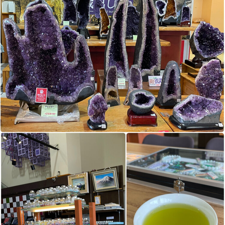 春のお花と富士山の旅 「道の駅 なるさわ」 お天気が良ければ富士山パノラマロープウェイに乗って、「富士山」や「河口湖」の景色を楽しもうと思っていたのですが、どんどん雲が増えて来て富士山が見えなくなってしまいました。 途中の「道の駅 なるさわ」で休憩をしながら、プランを考える事にしました。 「道の駅 なるさわ」は、真正面に富士山を眺めながら休憩ができる富士山対面型道の駅で、この日は富士山の裾野辺りだけしっかり見えました。 鳴沢村のおいしいお水「不尽の名水」が有って、地下300mから汲み上げる富士の名水を一人ポリタンク1個まで持ち帰ることが出来るそうです。 敷地内に富士山の歴史を楽しくわかりやすく学べる「なるさわ富士山博物館」が有ります。ゲートを抜けると目の前に大迫力の巨大恐竜が現れてびっくりしました。透明な富士山模型を通して内部のマグマや地下水などの動きを見ることが出来たり、隕石が展示して有って触る事も出来ました。 併設のミュージアムショップでは、山梨の地場産業である水晶研磨技術にちなんだ水晶原石や天然石などの宝石を買うことも出来ます。パワーストーンを選んでオリジナルのブレスレットを作ることも出来、オリジナルのアクセサリーも沢山有りました。高価な物は買えませんが、主人が興味を持って、磁石とパワーストーンのブレスレットを家族3人分買ってくれました。 366日誕生石が有ることを初めて知り、カラーストーン診断もしました。 ミュージアムショップで美味しいお茶を頂いて、富士山が見えそうにないので、河口湖方面の観光スポットをいくつか紹介して貰いました。 鳴沢地区は「ブルーベリー」の産地として有名で、7月中旬から8月頃にはブルーベリー狩りも出来るそうです。道の駅のショップで、「ブルーベリーゼリー」と富士山の溶岩にそっくりな砂糖菓子「富士の甘い溶岩」をお土産に買いました。 #春のお花と富士山の旅#道の駅なるさわ#なるさわ富士山博物館#恐竜#パワーストーン#366日パワーストーン#ブレスレット#ブルーベリーゼリー#富士の甘い溶岩#お土産#私のことりっぷ旅