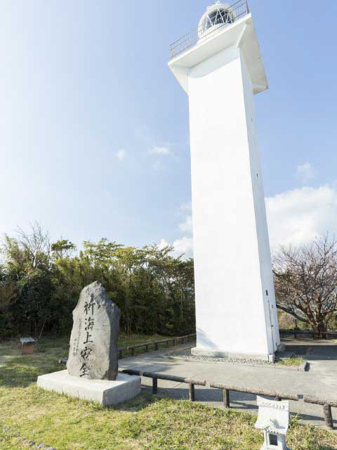 昭和47(1972)年に初点灯した灯台で、円筒形ではなく四角柱の造りが珍しい。眺望のいい高台にあり、一帯は稲取龍宮岬公園として整備されている。