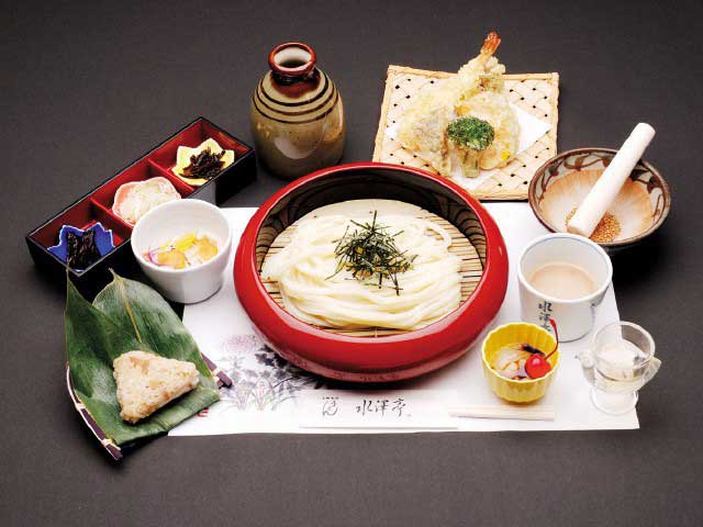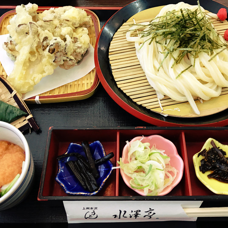 コシのある水沢うどんを多彩なメニューで楽しめる。人気の水澤御膳は、天ぷらや笹おこわ、デザートが付いたおすすめの一品。