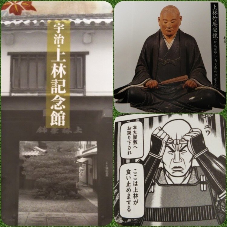 🚄GO TO トラベルで京都へ🚄 京都、三日目、最終日(11/2)  朝から雨☔️ かなりのザーザー降り 今日は宇治へ🍵😌✨ もう完全に京都駅の下地域の旅です。 こういうのCMでやっている #ずらし旅 って言うのかな……? 【上林(かんばやし)記念館】 ルビふらなくても読めるか‼️ だって〈綾鷹〉だもん😃 最近、梶 よう子さんの小説『お茶壺道中』読んだし コミック『へうげもの』(山田芳裕 著)にも上林のご先祖様が出てくるし、宇治には行ってみたいな🤗と思っていました。 ザーザー雨☔️で写真が撮れず、パンフレットでごめんなさい。 ㊨上……徳川家康に仕えていた上林竹庵の座像。関ヶ原の戦いの前、伏見城を守っていて戦死したのです。伏見城は捨て駒だったのね〰️😓 みんなわかっていて伏見城は落城したみたい。 だから家康は上林家に恩を感じていたのかな? 江戸時代、上林のお茶は将軍家御用達だったもんね。 ㊨下……『へうげもの』に出てくる、上林竹庵のキャラクター。上の座像を意識して描いたのかな? でもね、『へうげもの』を読むまで、上林はお茶🍵😌✨ それも〈綾鷹〉しか知らなかったんだわ。それも武将だった人がいたなんて驚き👀‼️ それも落城で戦死よ…… あっ、そうそう😃💡 〈綾鷹〉って上林の玉露のブランド銘 宇治駅に降り立ったとき、☂️にも関わらず、若い人がいっぱい‼️ だいたい何処に行くのかわかったけど…… だから古い人は 《ずらし旅》です。 #宇治 #上林 #綾鷹 #チーネコ本棚 #チーネコ博物館 #お茶 #徳川家康