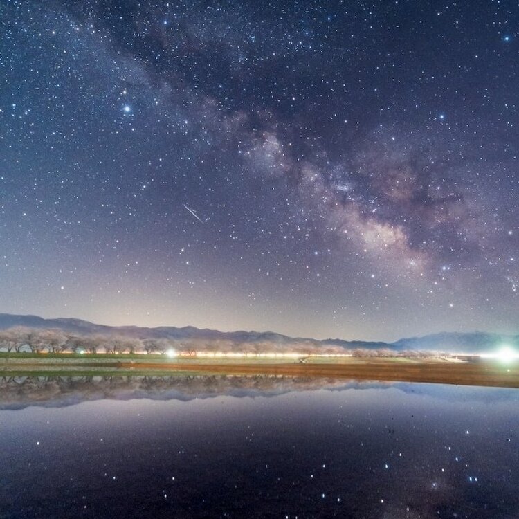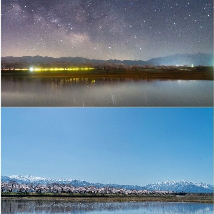 🌌富山県 朝日町 あさひ舟川『春の四重奏』🌛夜の四重奏 少し時計を戻します…。 仕事を終えて帰宅し準備をしたら、そのまま現地を目指しました🚙💨 花が五分咲きとか言っても、天気が良くて月が無ければ、その土地で見たいものが増えるのです☝笑 暗くてチューリップや菜の花の畑は分かりませんでしたが、嗅覚が水田リフレクションを嗅ぎ当てましたꉂꉂ😄 朝に近づくにつれ立ち上がる天の川。 そして、無風で水面は鏡のようにΣ(゚ロ゚*)✨ 自分史上最高の天の川リフレクションに感動です🥳 🔹🔹🔸🔹❀🐦✴ 🔸🔸 ✴🐦❀🔹🔸🔹🔹 (昼間の明るい時間に見る場合、スマホの明るさ上げるとちゃんと見えます) 【1】立山連峰と桜は弱いですが、天の川とリフレクションも入れて、見事に四重奏です✌️ 【2】田んぼ2枚だけ水を張ってくれてあったので、目が慣れないうちはリフレクション少なめになったり笑 高速を走る車の光が色とりどり過ぎて逆に選んでみました👀 【3】昼の写真とスケール同じにしてならべてみました。 舟川桜並木を高速道路が横切るので、右端あたりは道路の奥に桜並木となって途切れてしまうんですねー。 #富山県 #朝日町 #あさひ舟川 #春の四重奏 #立山連峰 #春風さんぽ #ヒーリング旅 #Myことりっぷ #桜 #星景写真 #天の川 #リフレクション #富山きときとトリップ22春