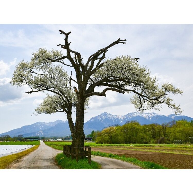 🌳長野の❁山梨の木(花)を見に〜🎶 野辺山の農道の真ん中に 突然現れる🌳ヤマナシの木 こちらも❁*。満開でした〜🎶 このヤマナシの木と星空を撮る方も多く 色々な方の過去写真を見ると 数年前までは、もこもこの枝振りが見られます。 今現在は かなり枯れ枝が😢 平成17年で樹齢250年超えとあったので 樹齢270年近いらしいです。 木の幹が痛々しかったです。 どうやら木が病気にかかってしまったとの事です💦 野辺山は、北海道に負けず劣らず 冬、氷点下20度くらいまで 気温が低くなる事も(((゚〰゚)))❄❄❄ そんな厳冬を耐え 来年も綺麗な花を咲かせて欲しいですね❁¨̮ 🅿️駐車場はありません。 明るい時間は大きな🚜農作業車が通る事もあります。 なるべくですが、少し遠くなりますが 車は広い場所に停めて歩いて見に行く事をおすすめします。 野辺山駅周辺 R141 沿いにも ヤマナシの木が白い花を咲かせていました❁*。 2022.05.08 #野辺山 #野辺山のヤマナシの木 #ことりっぷ長野 #長野県 #長野 #山梨 #八ヶ岳 #ヤマナシ #ヤマナシの木 #ヤマナシの花 #花 #ヒーリング旅 #Myことりっぷ 過去に、ドラマ『獣医ドリトル』 に登場した、🌳ヤマナシの木。 この時はまだもこもこしていたみたい😂 小栗旬さんもロケで訪れているようです。 (ドラマ見ていません😅) サウンドトラックのジャケット見つけました。 ❈ ❈ 追記 ❈ ❈ 2024年7月 強風で倒木してしまったとの事。 ヤマナシの木は撤去され 現在は見る事が出来ません。 残念です。