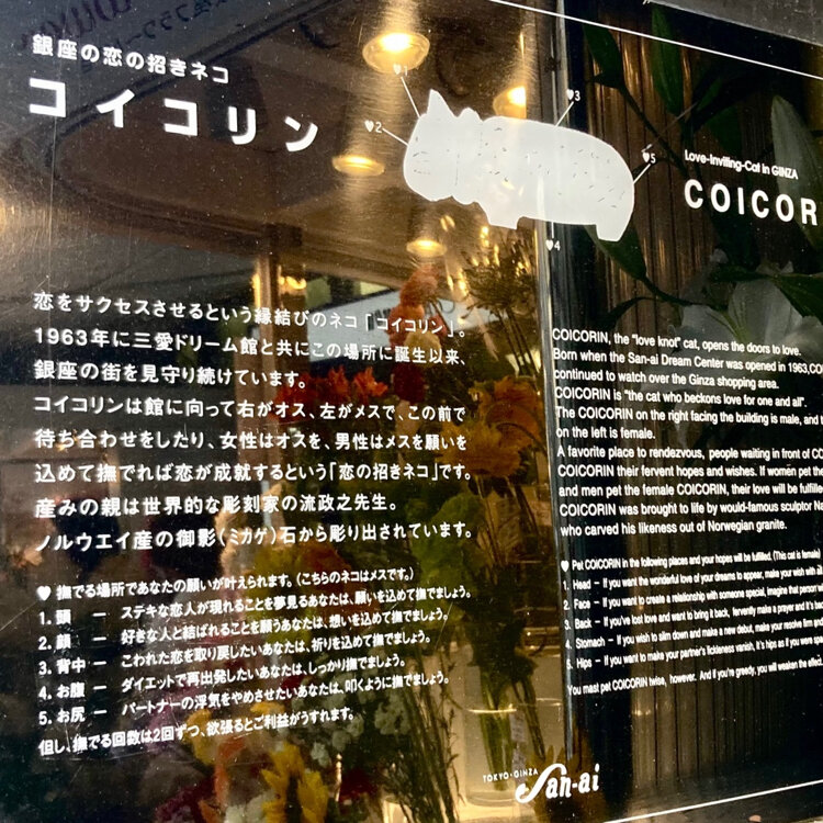 🐱♥️🐱銀座の恋の招き猫 【コイコリン】をご存知ですか? 恋をサクセクさせる縁結び猫ちゃんです🥰 銀座四丁目交差点の三愛ドリーム館。写真⑤ 向かって右側にいるのが【♂ごろべえ】写真① 向かって左側にいるのが【♀のんき】写真② * 女性はオスを、男性はメスを 願いを込めて撫でれば恋が成就する 恋の招き猫なんです✨❤️‍🔥✨ * 🤍🏹 ̖́-撫でられすぎて2人とも お顔が平たい族に😂 メスの【のんき】の方がすり減っているのは不思議ですね😆 のんき&ごろべえは1963年、三愛ドリーム館と共に誕生しました🎂🎊🎉 * 叶えたい願いによって撫でる位置が違います。 * 頭▷素敵な恋人があらわれることを夢見るあなた 顔▷▶好きな人と結ばれることを願うあなた 背中▷▶▷壊れた恋を取り戻したいあなた お腹▷▶▷▶︎ダイエットで再出発したいあなた お尻▷▶▷▶︎▷パートナの浮気をやめさせたいあなた * 当てはまる願いはありますか😊💕 (๑´•ω•)۶”撫でる回数は2回ずつ!! 欲張るとご利益は薄れます🙏🏻💭 * 私は 通り過ぎる時どっちもなでなでなでなでしちゃいますけどね💕 * #私のことりっぷ2022 #Myことりっぷ #ことりっぷ東京 #銀座 #三愛ドリーム館 #銀座の恋の招き猫 #COICORIN #ごろべえ #のんき #コイコリン #カメラ #fumitubu #ふみつぶ〜ぬ #お写ルン歩 #22日はねこの日 #街中アート #お写ルン歩♬♡