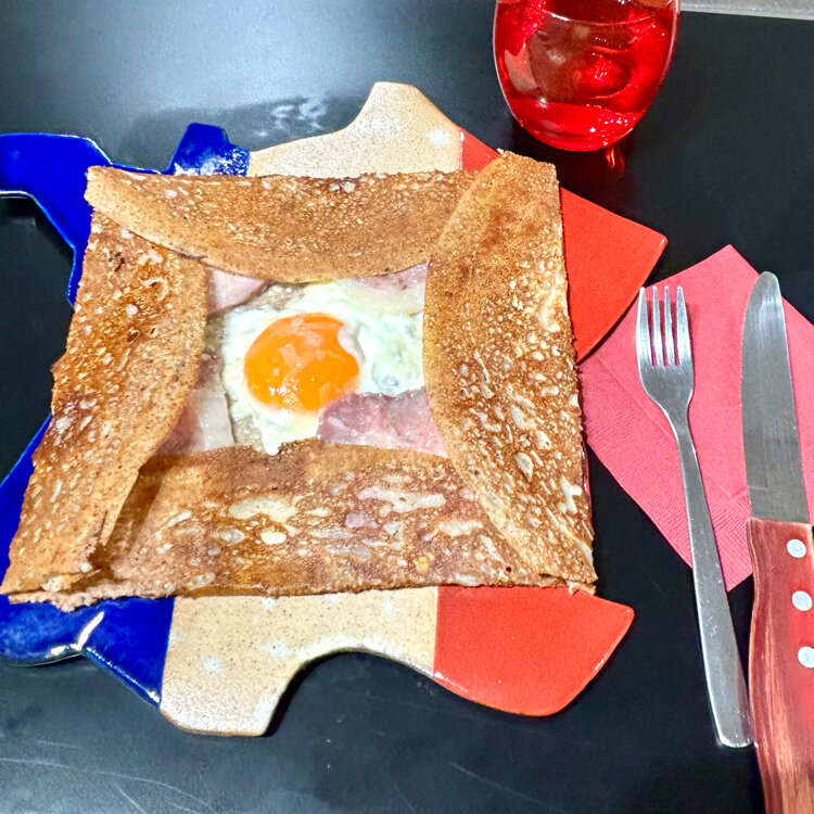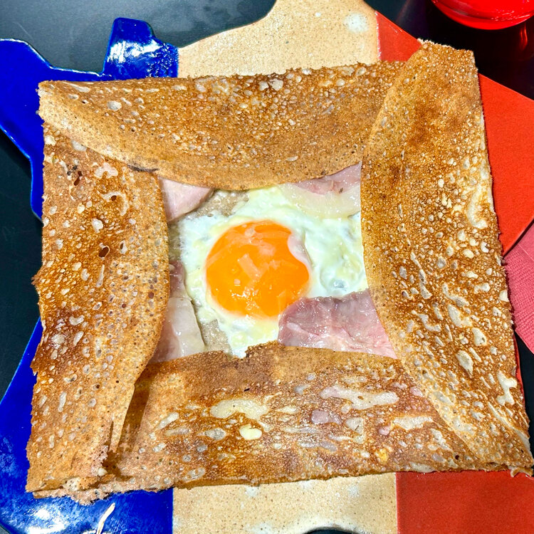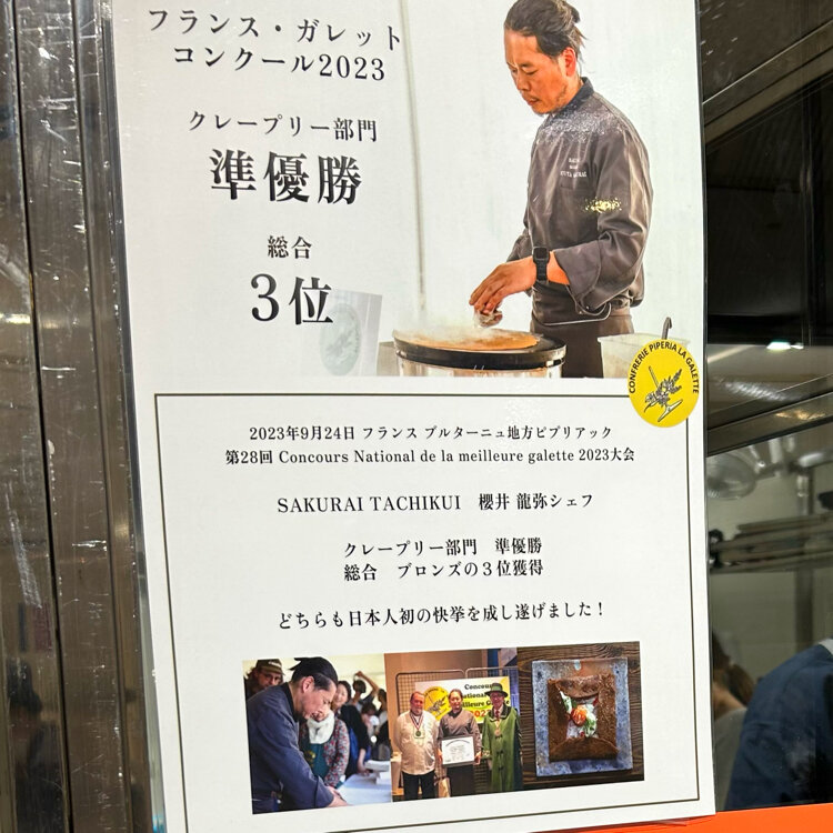 ちょこっと京都 夏 ② 「ジェイアール京都伊勢丹」 < フランス展 2025 > *PART2 (2025年8月5日(火)~8月10日(日) 最終日午後6時終了) <SAKURAI(サクライ)> ・ガレットコンプレット シェフ自慢の白ハム、丹波産の卵、日向牧場のモナミ、フランス製コンテチーズ。素材にとことんこだわって作る味わい豊かなガレット。 (各日30点限り 1,980円) 2023年フランスのガレット大会で日本人初のクレープリー部門準優勝と総合3位 獲得した「SAKURAI 」オーナーシェフ櫻井龍弥さんのガレットを頂きました。 「丹波篠山」に有るお店にいつか行きたいと思っていたのですが、完全予約制でなかなか行けずにいたので、絶好のチャンスでした。 お花のブーケのようなガレットが可愛かったのですが、数量限定の「ガレットコンプレット」が気になっていたので、オーダーしました。 カウンターに座ると目の前に用意された特注のフランス型のお皿が厨房に運ばれて行きます。 ワクワクしながら待っていると、良い匂いと共にお皿に乗ったガレットが運ばれて来ました。 お隣りさんがどこから食べようかと迷われていましたが、ルールは無いのでご自由にと言われていたので、私は縦三分の一を更に三等分してそのままで味わって、次に卵を崩してつけながら頂きました。ガレットそのものは表面はカリッと、もちもち生地で、ハムとチーズが凄く美味しくて、今まで食べたガレットの中で最高のお味でした。 #ちょこっと京都 夏 #ジェイアール京都伊勢丹#フランス展2025#PART2 #SAKURAI#ガレットコンプレット#私のことりっぷ旅#ゆるり夏時間