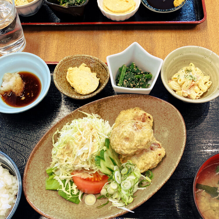 🐦美味しい定食屋さん♡ 豆ナ茶屋さんへ行きました🚗, o O 豆ナ茶屋は障害者の地域就労の場所として 開店しました😊 お店の由来は広島弁のまめな(元気な)と 健康によい豆を使った料理を作っていきたい という思いをかけて 茶屋はみんなが集う場所にしたい という思いからだそうです🎶 ランチは丼ものが2種類と日替わりの惣菜で 近隣地域の素材を極力使うようにされています 今回は里芋のコロッケ定食❤️ ほくほくの里芋コロッケがとっても美味しい一品 大根おろししょうゆにつけて食べます🎶 他のには  *ちりめんのだし巻き卵 *ほうれん草の胡麻和え        *マカロニサラダ                *ご飯*お味噌汁         ご飯とお味噌汁はおかわり自由です♡ お茶は地域の産物びわの葉茶🍵 とっても美味しい✨ 食後はケーキセットを注文しました ティーサーバーに入ったコーヒーの粉と砂時計⌛️ 店員さんが濃く出したいとき薄めが良いときと 細かく説明をしていただきました☕️ ナッツや胡桃がごろごろ入った パウンドケーキと一緒にいただきました( ´ ▽ ` ) 大きな声で丁寧に一生懸命接客している姿や その他の方のサポートの声かけなど いろいろなことに感動でした🥺🎶 美味しいランチと皆さんの働かれている姿に 癒される時間でした*・゜゚🥗・*:.。..。.🍊・*:.。.🥔 .。.:*・゜゚・*🐟 * * #豆ナ茶屋#障害者就労#カフェ#ランチ #日替わり定食#里芋コロッケ#鯵の刺身 #びわの葉茶#Myことりっぷ