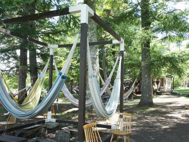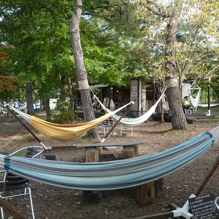 愛犬と過ごせるPICA山中湖ヴィレッジ内にあるカフェ。木々の間でハンモックに揺られながら昼寝や読書をしたり、コーヒーやホットドッグを味わうことができる。