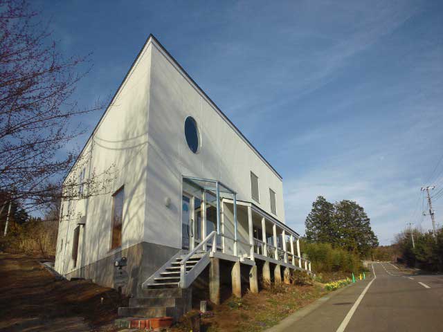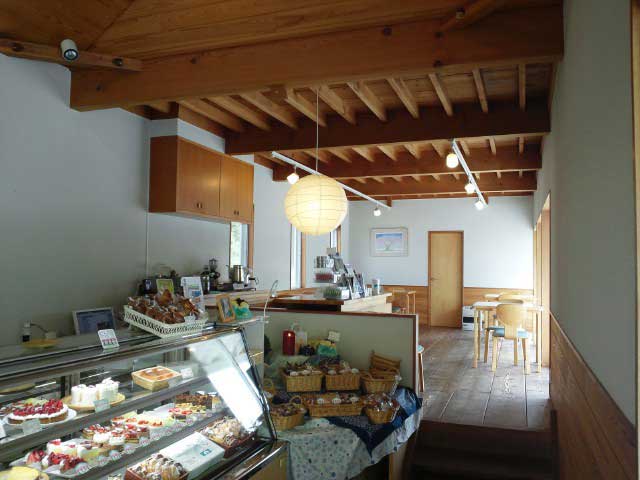 帆船をイメージした個性的な建物のフランス菓子店。あけの金時など旬の地産食材を盛り込んだケーキや焼き菓子が並ぶ。