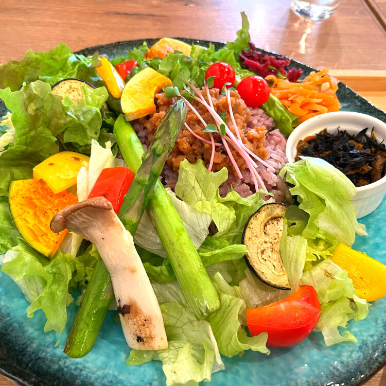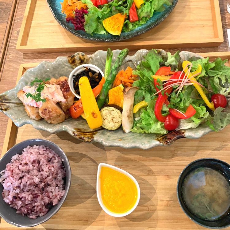 野菜たっぷりランチ🍆🥕🍅🥦 . 河津桜を堪能した後に橿原の今井町の街並みを見に行って来ました. ならまちにくらべるとかなり小規模でしたが 昔ながらの街並みが広がっていました. その奥の方にある cafeたまゆらさんでランチを頂きました. 野菜ソムリエが居るお店らしく たっぷりのお野菜の乗ったランチ.. 私はヴィーガンプレート *大豆ミートの肉味噌そぼろ丼にグリル野菜と小鉢 主人はたまゆらプレート  *チキンの照り焼き(しば漬けのタルタルソース) グリル野菜と小鉢 どちらもお味噌汁がついて自家製の人参ドレッシングでいただきます. ドレッシングが美味しくて、野菜がもりもり食べれました. . ショーケースには可愛いスイーツが並んでいました. 万華鏡のような飲めるチーズケーキ🧀 テイクアウトも出来るそうなので、また次に来た時に飲んでみたいなぁと思いました. とっても可愛いカフェでした. . 帰りに近くのだんご庄できな粉団子を買って帰りました. とっても柔らかくって2.3本はぺろっと一気に食べてしまう位に美味しかったです. . 📷2024.3.2 #春色さがし #私のことりっぷ旅 #今井町 #橿原 #ことりっぷ奈良 #cafeたまゆら #野菜たっぷりランチ #ヴィーガン #万華鏡 #のむチーズケーキ