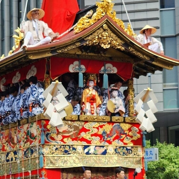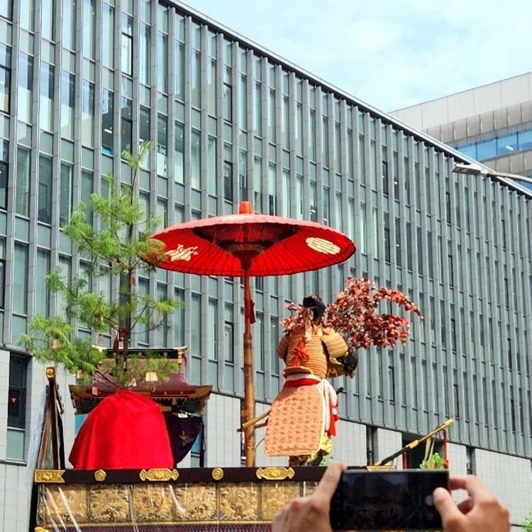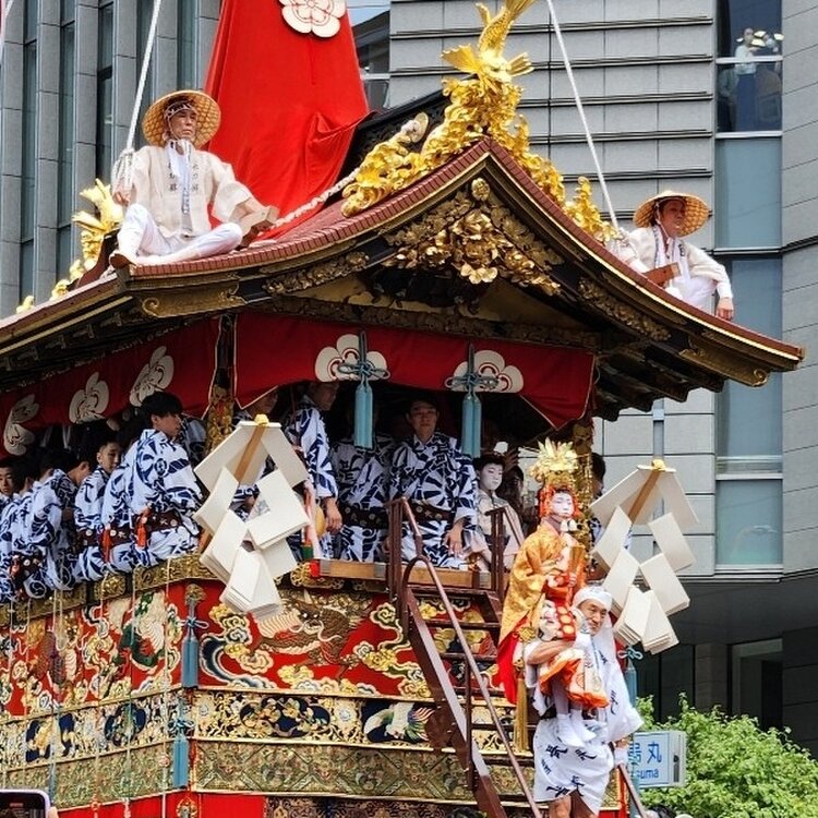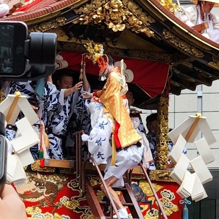 【京都・祇園祭】⑩ 巡行をどこで見るかが問題よね🤔 地下鉄で移動するから、今日は地下鉄のみの1日乗車券を購入。 スタートの四条烏丸かぁー 混んでるんだろうね🤔 とりあえず四条駅で降りてみる❓️ 8時20分くらいに到着。ビルの壁にへばりつく感じ。 ここはスタート地点なので9時15分くらい前から長刀鉾に乗り込む囃子方。ゾロゾロ梯子を登っていく。えっ😱💥 どんだけ乗るのぉ~って感じ。 最後に強力さんに担がれたお稚児さんが登場。 時間は8時48分でした。お稚児さんは地面に足を着けてはいけないんだよ🙅‍♀️ 生き神様だからね(^-^)/ 何年か前に祇園祭のドキュメンタリーをみたのよ。長刀鉾町には住人がいない。だからここに会社を持つ企業が支えている。 お稚児さんになる男児も山鉾町以外の老舗の店のご主人の子どもにお願いしているんだとか。〈わかさ生活〉も長刀鉾町に本社ビルがあるから、支えている企業の一つだよね。 9時、くじ取らずの長刀鉾がスタートです。くじ取らずの山鉾が5基あって、あとは毎年、順番をくじで決めるんだね。 今年の2番は油天神山。分からなくなるので、順番を調べて来ました。 私の押しの保昌山は8番。 アレー( ゚ 3゚) 保昌の人形が向こうを向いている‼️ 移動しよう。次の場所も考えてあるんだよ。地下鉄に乗って場所移動です。 #祇園祭 #山鉾巡行 #長刀鉾 #油天神山 #保昌山 #混み混みだったけどお稚児さんがあがるところ見られてラッキー