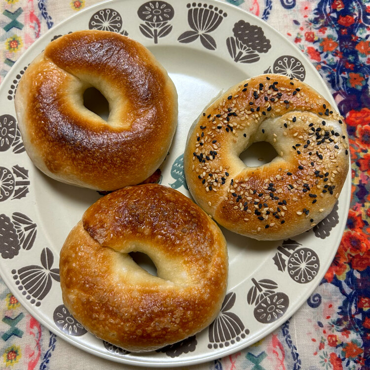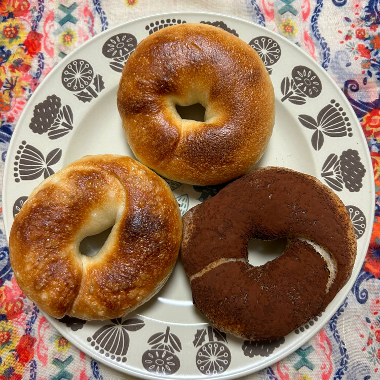 「ベーグルとベイク 月」① 「マツコの知らない世界」で紹介された2023年7月に自宅のガレージでオープンしたお店です。週2日(日曜日と水曜日)のみ営業で、ベーグルと焼き菓子を中心に販売されています。 弾力のあるもっちり生地に具材があふれる独特の惣菜ベーグルが人気です。 写真2枚目... 青紫蘇明太子チーズ、メイプルバターソルト、胡麻あん 写真3枚目... プレーン、塩バター、ティラミス 写真4枚目... チョコレート いつか食べたいと思ってはいたのですが、水曜日と日曜日のみの営業なので、ハードルが高いなあと思ってすっかり忘れていました。たまたま「フジヤマプリン」さんに行く途中に並んでいる人が見えて、そうだーと思い出して、小走りで様子を見に行きました。 3人程並んでいて、まだ、商品も沢山有ったので、ワクワクしながら並んで、ショーケースを見ながら悩みに悩んで買いました。 賞味期限は当日中だそうなので、お家に帰ってすぐにおやつにチョコレートを食べました。 夜ごはんを和食からイタリアンに変更して、温め直して家族でシェアして美味しく頂きました。 冷凍保存は可能だそうです。 #ベーグルとベイク 月#ベーグル#京都西京極#マツコの知らない世界#私のことりっぷ旅#ことりっぷ旅2024