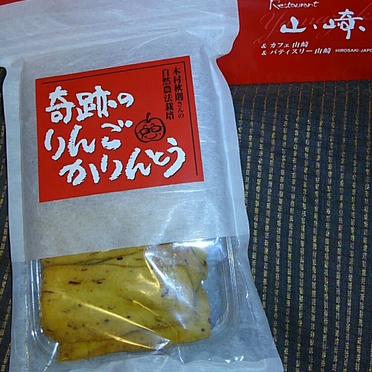 パティスリー山崎 【奇跡のりんごかりんとう🍎】 りんご生産者の木村秋則さんが自然栽培(無農薬・無肥料・無除草)で育てたりんごを使用したかりんとうです。 果肉も皮も芯も種も、丸ごと入った かためのかりんとう! 歯ごたえのあるカリカリ食感で りんごのほのかな風味が感じられる 優しい味わいのお菓子です☺️ もちろん添加物不使用! すごく美味しいの〜ლ(´ڡ`ლ) * いつものように 全部出して並べて写真撮影🤳 15枚入 ¥750 止まらなくなって あっという間に完食🫣 * パティスリー山崎さんは レストラン山崎・りんごカフェ山崎の 並びにありますよ〜🍎 奇跡のりんごかりんとう おみやげにおすすめです🛍🙆‍♀️ * 写真4枚目の左、アップルパイのお店を紹介した「弘前アップルパイガイドマップ」 とても便利なので ぜひ入手して! * #木村秋則 🔍 素敵ユーザーさまの投稿をご覧ください! * 写真5枚目に りんごカフェ山崎にて 皮むき器でクルクルしている時の写真を載せました 従姉妹撮影です🤳 * #ことりっぷと一緒 #ことりっぷ青森 #ことりっぷ弘前 #秋の装い #パティスリー山崎 #りんご #奇跡のりんご #奇跡のりんごかりんとう #かりんとう #自然栽培りんご #あおもりんご狩り #ふたりんご弘前👭 #お土産 #おみやげ #おみやげ図鑑 #fumitubu #ふみつぶ〜ぬ #りんご狩り