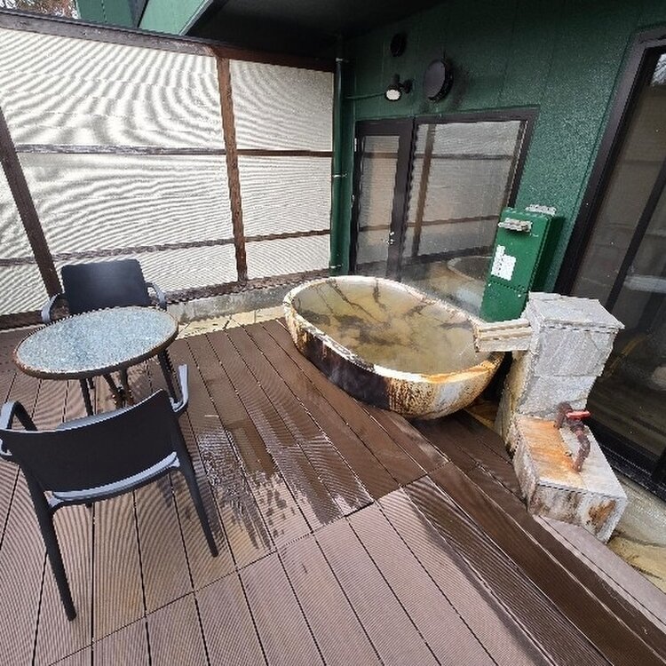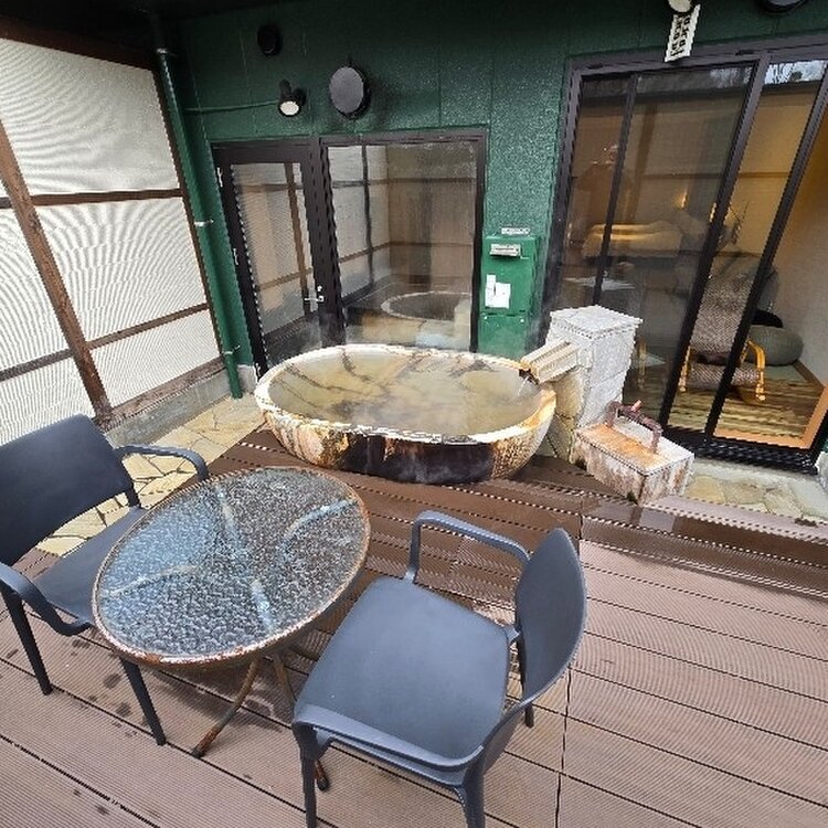 全室にテラスと源泉掛け流し風呂が付いた大人の為の宿。併設の優香苑となごみの湯大浴場も利用可能。