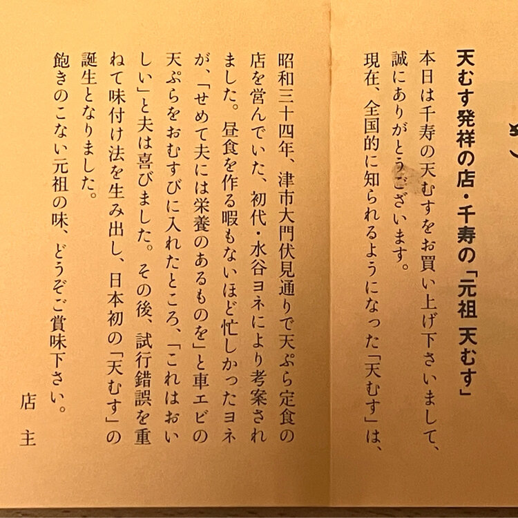 津 元祖めいふつ天むす千寿さん🍙 天むすです☺️🍙🍤✨ 、 おいしいですよね😋天むす 、 津の人は差し入れなんかでよく千寿さんの天むす買って行ったりします☺️ 、 近くで仕事を終えたので買って帰りました😊 、 三重県内、名古屋近郊にある天むす千寿さんですがこちら元祖めいふつ天むす千寿さんののれん分けになります💁‍♂️ 、 のれん分けのお店からは¨元祖¨の文字が消えて🫥 めいふつ天むす千寿◯◯店 となります💁‍♂️ 、 津では海苔の巻き方も違いがありと海老が見えてないのが元祖の天むすになります🍙✨ 、 、 海老が見えてない🫣のはもともと夫婦で営む天ぷら屋さんだった千寿で、食事の時間もなく忙しくしていた女将の奥様(ヨネさん)がご主人に海老天をおにぎりに詰めたのが発祥であり当時の形をそのまま残しています😊 、 海苔の巻き方は独特でどうやらどこかで見た上皇后美智子様が身につけていたストール🧣の様にしたという事らしいです😊 、 以後常連客の裏メニューとして天むすは提供されてましたがあまりの好評で天むすを津の名物にしようと天むす専門店になりました🏠✨ 、 いつか「めいぶつ」になるとの想いから濁点を外して「めいふつ」です☺️ 、 注文が入ってから握ってくれる☺️ 今は娘様が引き継いでいますがヨネさんもたまに店の隅に座っている時があり ありがとうと立ち上がってお辞儀してくれます😊 讃岐うどん池上製麺所のるみばあちゃんみたい👵✨ 、 お味は最高においしい☺️塩加減と高級コーン油で揚げられた海老天が最高に合います😋 、 #あきらの東海